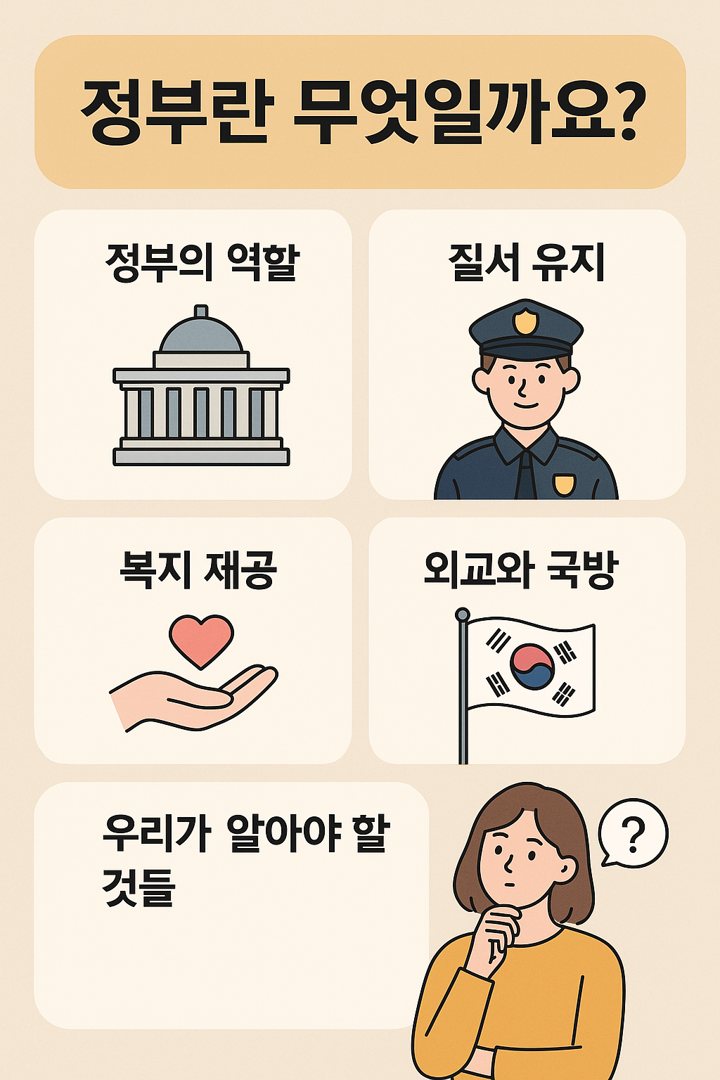 오늘은 조금 진지한 주제로 이야기해보려고 해요. 바로 ‘정부’에 관한 이야기인데요. 평소에 “정부가 이 정책을 시행했대요”라든가 “정부에서 지원금이 나온대요” 같은 말을 자주 들으실 거예요. 하지만 막상 "정부가 뭐야?"라고 물으면 설명하기 어려운 느낌, 있으시죠?